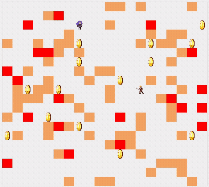A WinForms coin collector built to demonstrate the Memento pattern — procedurally generated maps, BFS enemy AI, and a full save/load system.