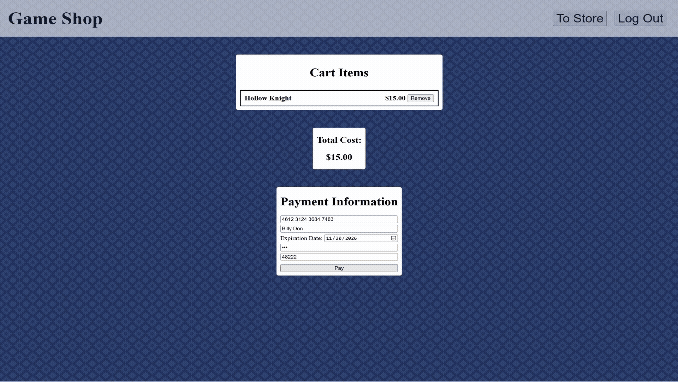 A multi-page game store with login-protected pages, a persistent session cart, and a checkout flow that adds purchased games to the user's collection.